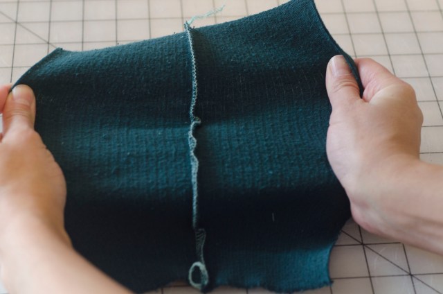 Three different ways to sew knit fabric: from left to right, a straight stitch (not recommended for seams that will need to be stretch out a lot because they may pop open), a zig zag stitch, and a serged seam.