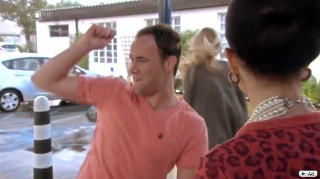 Mr. Fitch realises he’s been caught and um… runs away! Mrs. Fitch runs after him and beats up on him, this reminds me of what happened to Marissa Cooper’s family on The OC. I am sorta stressed out for them. She yells, “We are so finished! Consider yourself divorced!”