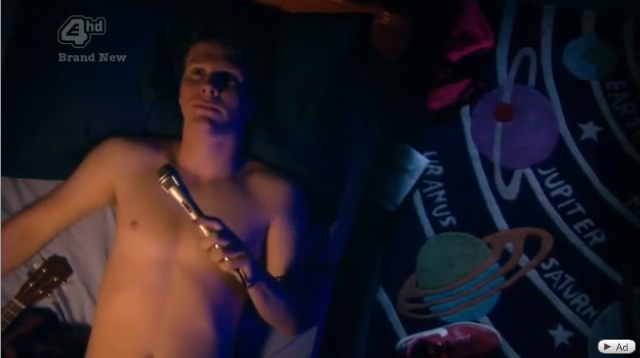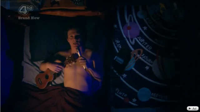 3. In bed, JJ lies in bed half-naked with his ukulele and records his diary entry, no doubt an instruction from his shrink. He calls it his “Captain’s Log” which reminds Crystal of Avatar except Skins is so much better than Avatar. It reminds Riese of Star Trek: The Next Generation, which, like Skins, was good.