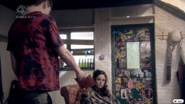 Cook passes Effy the notebook and waits nervously while she reads it. Cook tells Effy that he’s going to find Freddie. Go-Go-Gadget Friend-Radar.