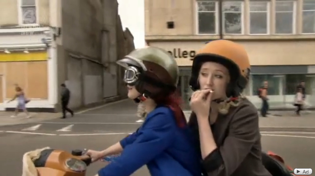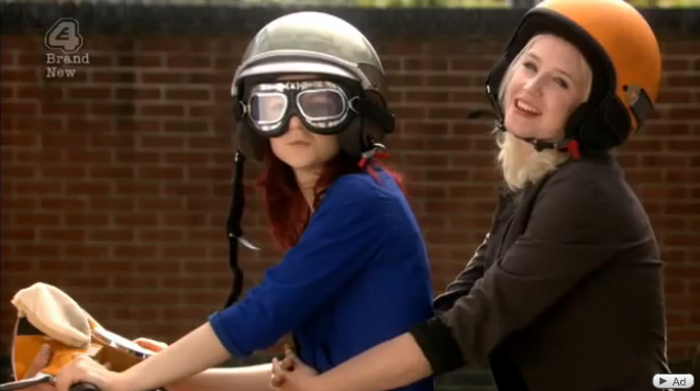 Naomi and Emily are getting in some practice for Mardi Gras, cruising down the street on Emily’s orange scooter and sharing a cigarette. They’re having fun! They’re laughing! This is the Skins I love.