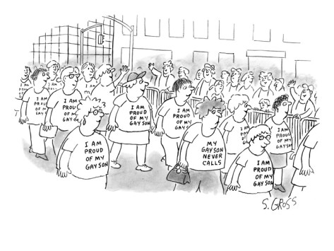 True fact: for whatever reason, really staunch allies make me cry. Especially PFLAG parents. I try to avoid other people’s eyes when I see them in Pride parades because Pride is supposed to be for debauchery, not tears. That New Yorker picture up there? Despite the fact that those are just little cartoon moms and dads and not even real people: tears. So many happy tears.