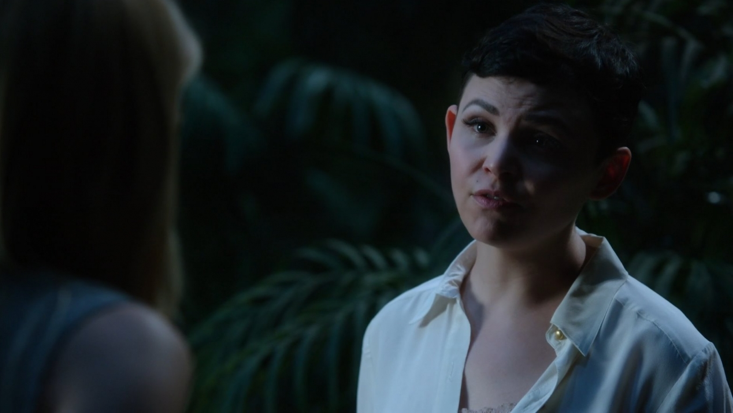 While everyone else is still processing Neal’s being alive while freaking out about some footsteps that Snow saw, Regina takes this opportunity to peace the fuck out because she has had it up to here with this blow-worthy popsicle stand. Emma doesn’t want her to go because who else will keep her warm in her sleeping bag, but Regina reminds Emma that they have a son who needs saving, and if she could put down the incredibly clunky plotline that is this bullshit love triangle, maybe they’d all realize that the reason they came here was to save the kid who desperately needs them. Actually, she says she’s going to save “our son,” which is even better and not a run-on sentence.