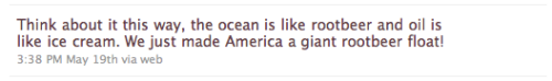 Even after this obviously bogus follow-up, hundreds of people were RTing and accepting that this account was actually BP, which naturally pissed off the company (who has time to peruse tweets, mind you). The real BP contacted Twitter in an attempt to lay down the law. Turns out, Twitter’s satire clause actually allows for this type of parody, stating that accounts such as @BPGlobalPR are totally Twitter kosher as long as the bio states that the account is fake or is unofficial.