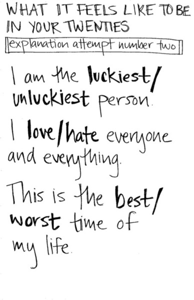 Twenties seem to be a time of unsettled crazy hopeful dissatisfied wonderful awful experiences.
