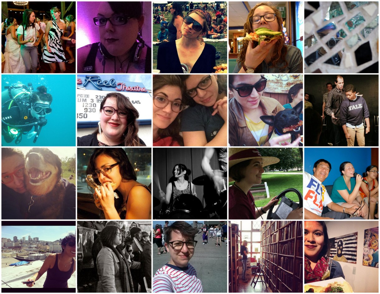 1st row, L to R: Alex dancing, Mari DJing, Laneia at Bonnaroo, Rachel putting away tacos, Fikri taking pictures 2nd row, L to R: July scuba diving, Mey at the movies, Kaitlyn watching Battlestar Galactica, Carmen brunching with Eli, Brittani killing it at improv 3rd row, L to R: Heather cuddling Margaret, Raquel chomping tacos, Stef slaying on drums, Maddie commanding a golf cart, Laura rocking karaoke 4th row, L to R: Robin on a sunny rooftop, KaeLyn fighting for justice, Nikki photobombing as Waldo, Riese perusing a used bookstore, Yvonne with tacos, beer and art
