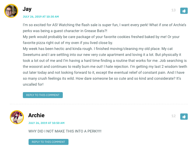 Oh wow! Hi yes! I am so excited for whoever it is that did end up getting that perk! Jealous, maybe, I was asleep when it posted and can’t afford $100 rn anyway, but still jealous. I’m sure its gonna be really cute and exciting when it happens!!!!!