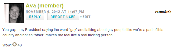 As a U.S. citizen, an Ohioan by birth and full-time gay, I’ve been riding a political high (some have dubbed it a “gloatwave”) since Tuesday. We won so many things! Did you see Riese’s election-inspired TIRTIL and Laura and Vanessa’s interview with Sally Kohn? Ali’s epic Election OPEN THREAD was a thing of patriotic beauty. And remember how the best-dressed Obama party attendee was our starlet, Brandy? Aren’t you excited about how much the GOP mucked it all up?