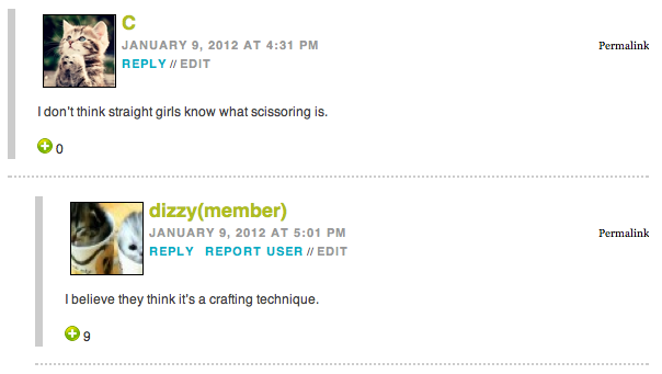 The 800 Times Better Than a Penis Award to Siren: “I don’t think any of the “how I got here stories” compare to mine: I was sixteen and one of the autostraddle writers popped up on chatroulette. She said she didn’t like boys, and I was like OMG ME NEITHER! WHAT DO I DO?!?? And she sent me here.”