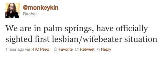 Sarah, via email: jess r., laneia and riese are in Palm Springs, figuring out the hotel sitch. Alex, Jessica, Rachel and I are still not there, because whatever car I take to Dinah apparently always ends up being hours late. But we’ll be there soon!