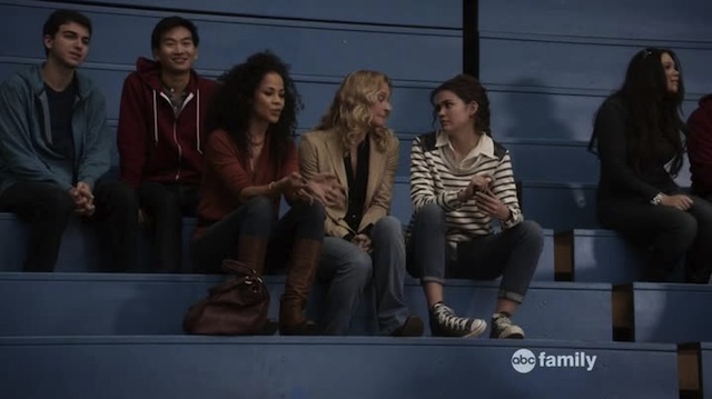 Callie is sitting in the bleachers texting Daphne when Stef and Lena show up. Callie says Daphne didn’t take the Kindles and Stef says they are all on probation and mentions the “company you keep” and Callie asks if she can’t be friends with Daphne and Kiara and Stef says, “Of course you can…” and I love Stef but she is so patronizing in this moment that I almost forget how hot she looks in that blazer with those jeans and boots. Almost. Callie says they want her to “make nice” with the privileged kids who probably took the stuff in the first place and Stef says, “I know this is confusing…” and I really want Stef to shut up so I can enjoy the view and Callie shuts her up by saying, “I’m not confused. This is exactly how the system works.” Preach.