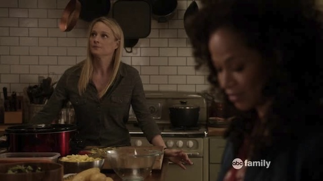 Stef gets home and tells Lena that Brandon is coming home. Lena wonders if that’s a good idea and Stef says, “Callie and Jude are being adopted on Monday so he’s gotta get over it.” Yeah, that’s worked so far. Lena wonders why Brandon was selling fake IDs and Stef cleverly avoids answering by saying, “What happened to our son?”