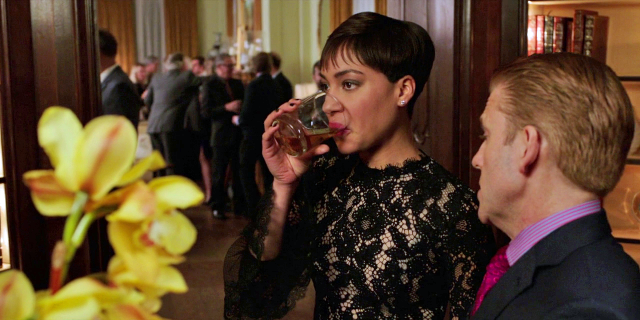 Lucca excuses herself to get a well-earned drink, or twelve, when Mini Cagney shows up and starts asking about rap lyrics. The amount of self-control it must have taken to not smash that glass over his head is truly commendable. But then he starts blabbing about what great arm candy she makes for Colin now that he is going to run for senator. Then he calls Lucca a steppingstone to office, the hot black girlfriend. “It’s like de Blasio!” he chirps.