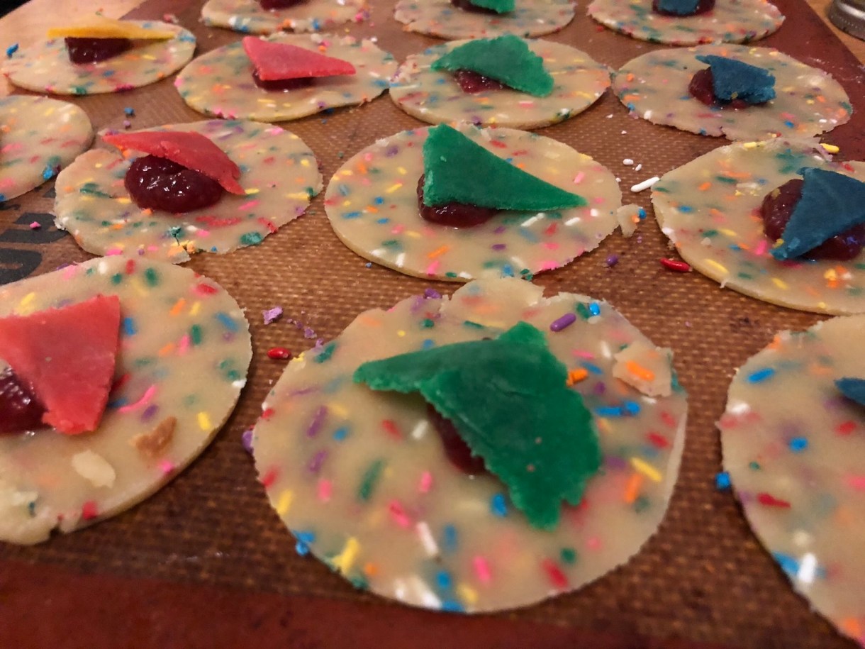 This option is new to me, suggested by my A-camp cabin-mate Maddy Jennewein, and is my new go-to for hamantaschen forevermore. All you do is lay out a pre-made rolled pie crust. Optional: to have a rainbow exterior, create a solid, even layer of sprinkles on your counter or on a cookie sheet and gently roll the crust out until the sprinkles are thoroughly adhered. The sprinkles will go on the outside (ie, sprinkle side down) when folding.