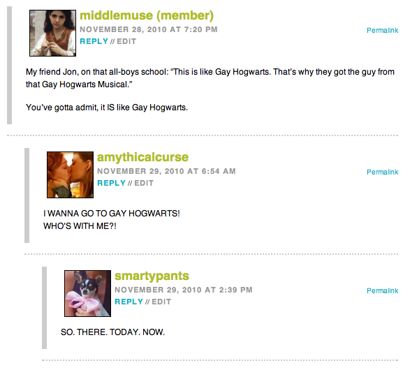 Perhaps if I spent less time thinking out such complex responses and more time studying id be better off…but regardless, my first comment award, thanks a million, put a smile on my face and gives me an excuse to have an extra drink tonight so that I can toast Autostraddle, the internet, and gayness in general, hooray! :-D