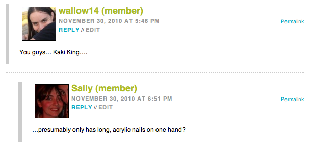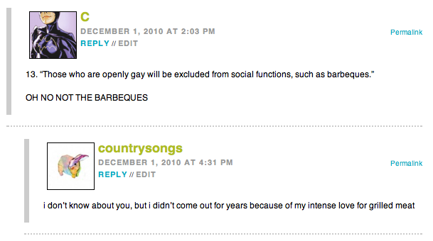 the thing is, while we lezzies love the snark, isnt there enough of that elsewhere? read any youtube or gawker or mainstream news/gossip rag comment feed and youre bound to find a few assholes. i dont think it’s too much to ask that after reading a post you might find particularly offensive, take a few seconds to think before you type, consider that the content was not written to uniquely appeal to your disdain, and keep the comments constructive and respectful.