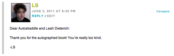 Natalie will be getting a signed copy of thxthxthx because Leah thought it was cute. But don’t Natalie’s triumph stop you from getting your own copy of the book; you can pick it up right here.