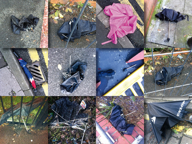Why can’t I just get rid of these? Why have I packed and moved three to five completely broken umbrellas with the rest of my crap across this city for seven years? Will there ever be a time I find myself surrounded by all these umbrellas when I actually need them to protect me from falling water outside? (This is a trick question, because none of the broken umbrellas are ever going to save or protect me. One stabs me when I carry it around because the cover has come disconnected from a loose metal stick, two are half caved-in, one is no longer secure and would probably blow apart within seconds of a storm.)