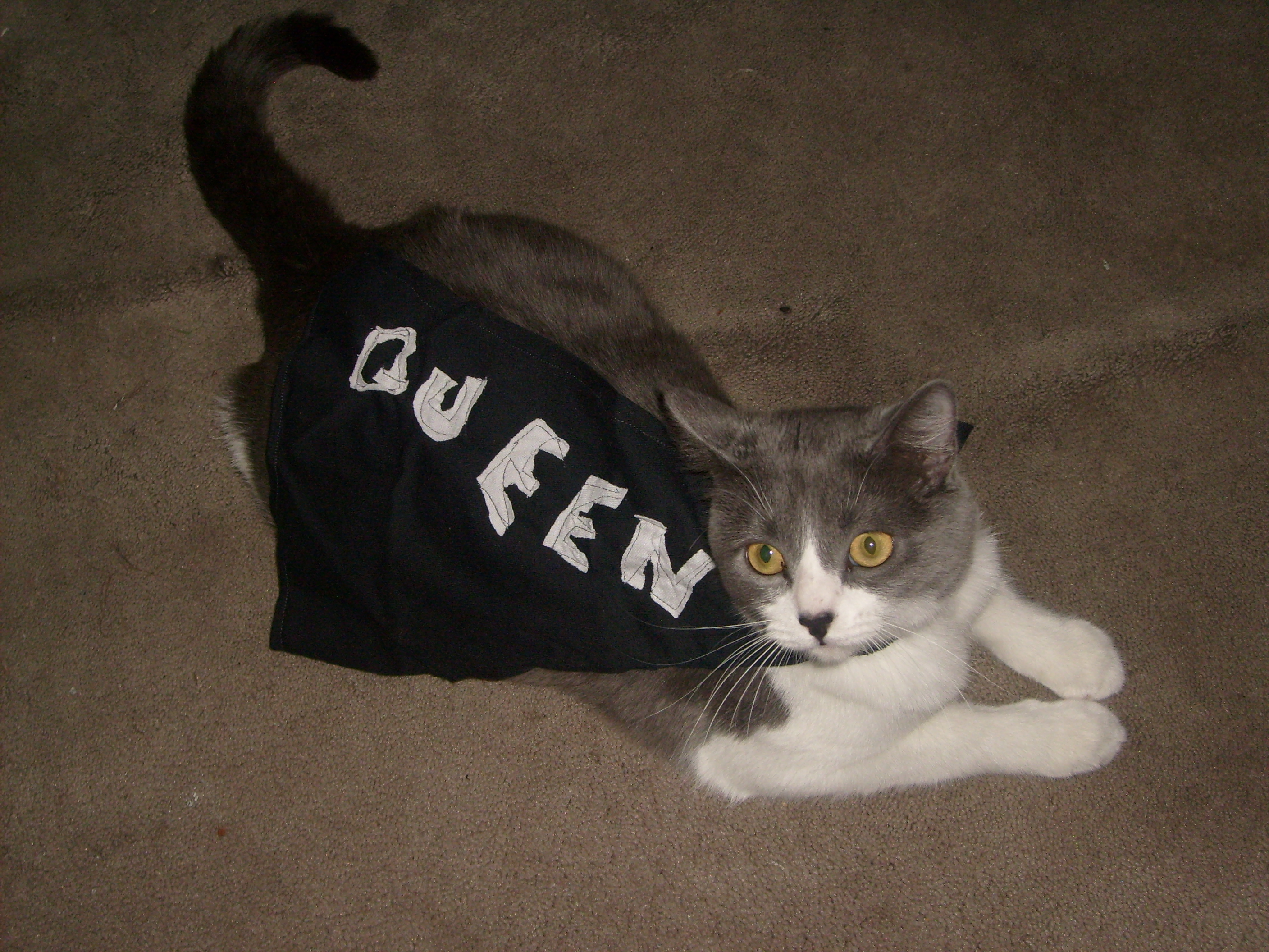 I like that everyone has their fancy store-bought costumes while my cat is sitting there in a homemade cape that just says “queen”