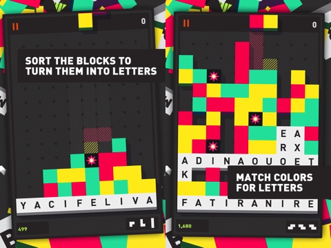 You start off with a set of Tetromino-like game pieces that fall from the top of the screen, and you’re meant to create horizontal rows with them. In Tetris, once a row is finished it’ll disappear; in Puzzlejuice, the row of colored blocks turns into a row of random letters. The more rows you create, the more letters you have to choose from to create words by dragging your finger on the screen. If you’re stumped, you can create little pockets of random letters by tapping on three or more matching colored blocks sitting next to each other. So it’s kind of like Tetris, kind of like a word-search game, and kind of like a color-matching game. I know, it’s a lot of things to keep in your head at once, but as you play you’ll find that the gameplay is pretty intuitive.