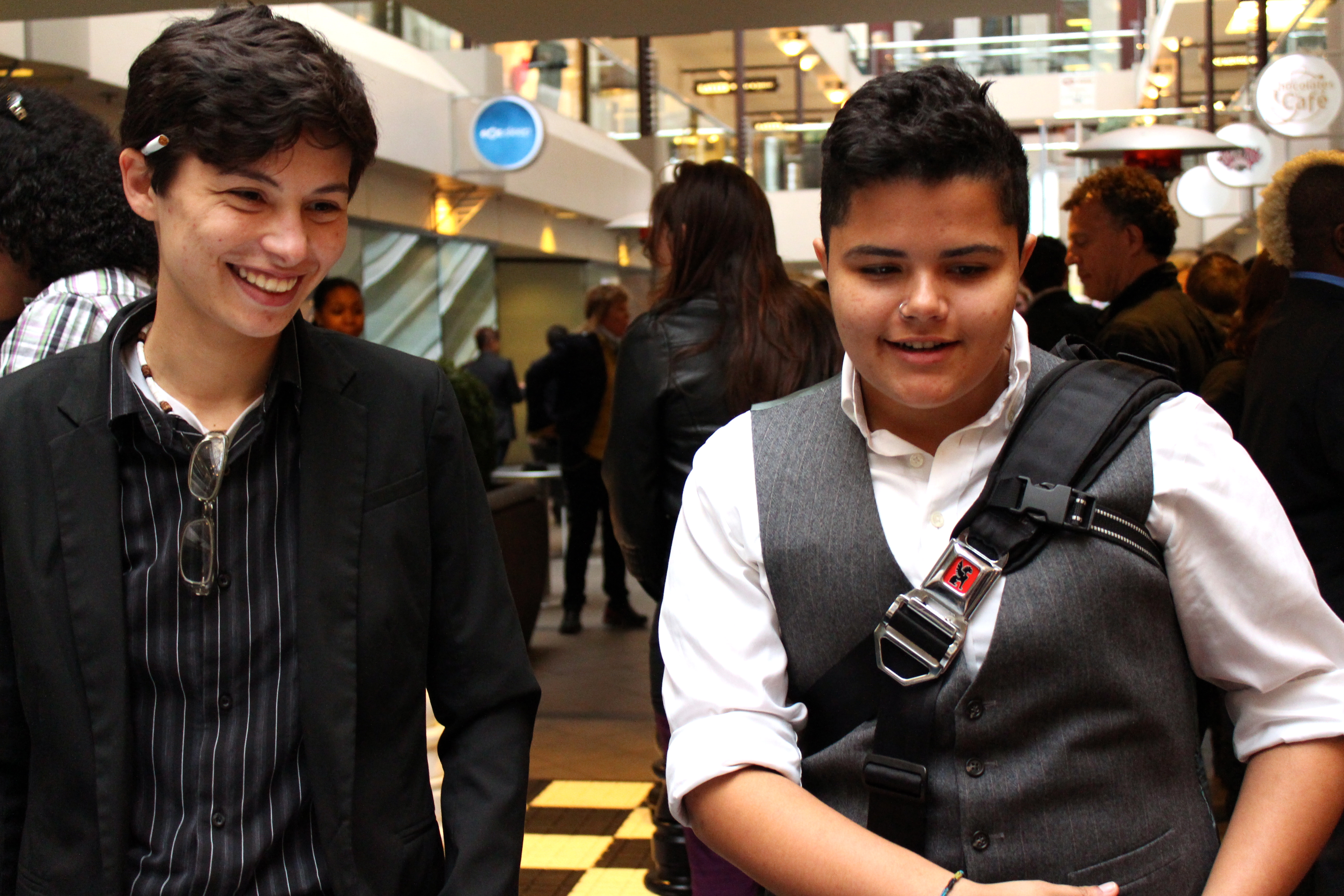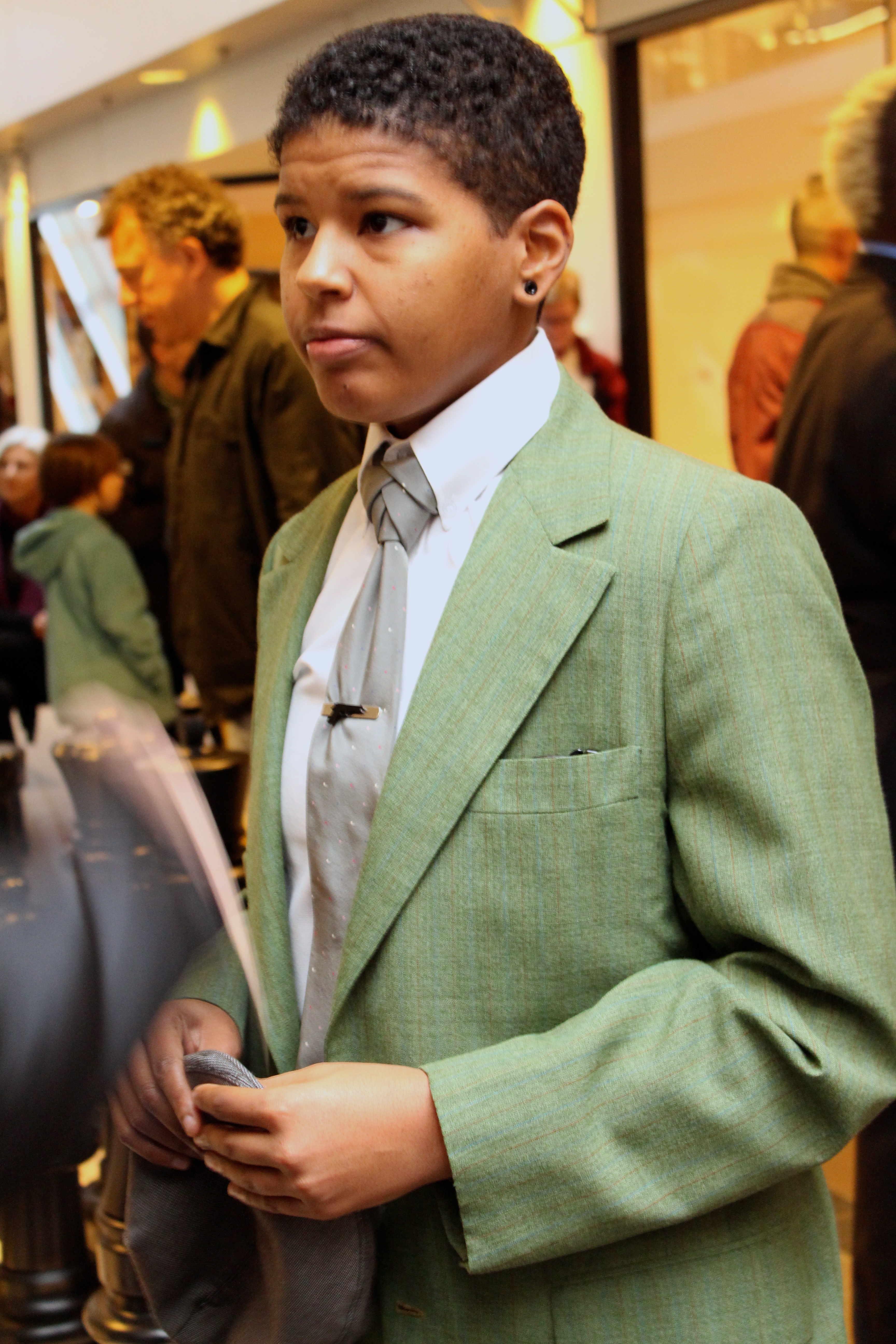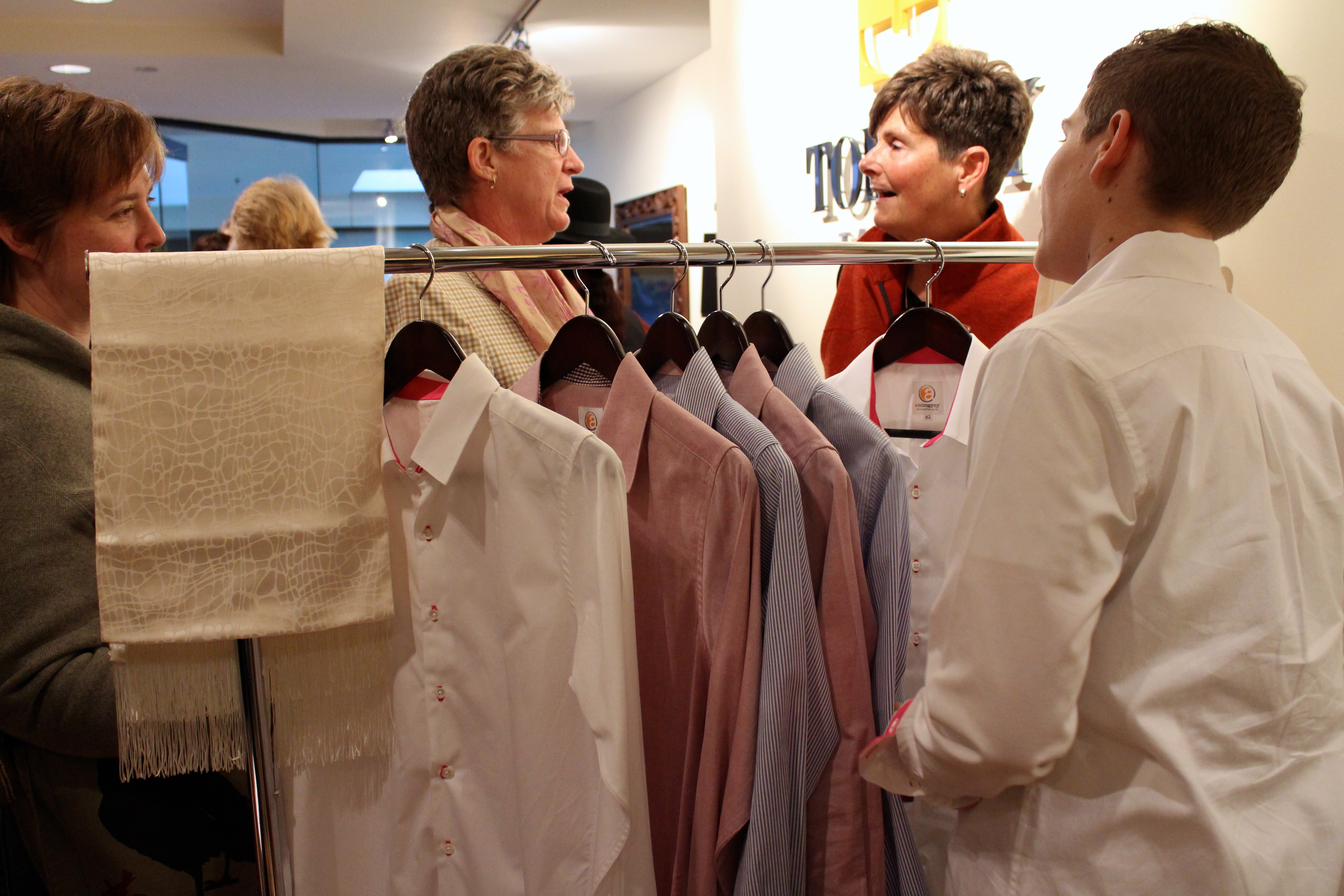 Tomboy Tailors is located at Level One of the Crocker Galleria in San Francisco, and during their opening half of the first floor was packed with people celebrating, mingling, and just generally talking with and smiling at one another. In the actual store, a corner bar and a piano shared the space with rad, thick framed mirrors and comfy couches where clients can wait before getting measured. It was all a great mix of old school tailor charm with a welcoming queer attitude.