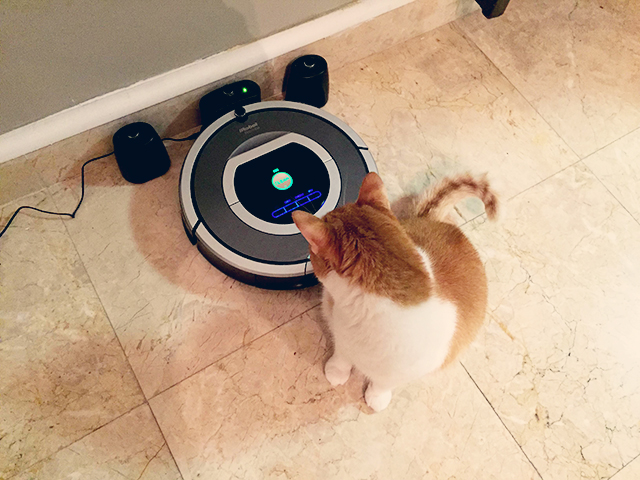 Because I have this obsessive need for tidiness, and because I work from home while my girlfriend works ten-hour days in an office, and because I’m like that tree from The Giving Tree, I do most of the housework in our two-story New York brownstone. A couple of months ago my girlfriend, Stacy, asked if I’d like a Roomba, one of those little disc-shaped vacuum cleaner robots that are most famous as the mode of transportation for that cat in the shark suit. Well, of course I said yes. Having a Rosie Jetson has always been a dream of mine.