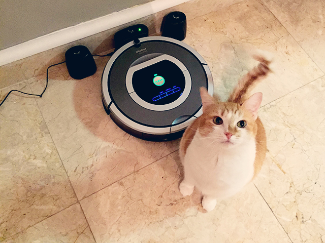 My Roomba’s name is Rosie! And I love her. She doesn’t love when my wife leaves nets or fishing line on the floor and forgets to pick it up before Rosie wakes up, however. Seriously, don’t let your Roombas eat fishing line…But Rosie knows she needs to work harder to clean my cat’s litter mat than she does the kitchen floor, etc. When Jelly (cat) and Rosie first met, Jelly followed her around to be sure she was trust worthy. She doesn’t think much of her now unless she’s cleaning under whatever Jelly’s sitting on or she coming right for Jelly. My 60 lbs dog, on the other hand, is completely terrified of Rosie. I highly recommend saving up for one if you can, especially if you have pets. They’re a huge time/life saver.