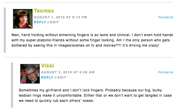 The Power of the Philosopher’s Stone and Unintentional Reference to Mikey’s Sunglasses Award to Julie Goldman: “I am one of those judgmental douches who hasn’t even watched the episode — but really do I need to? Do I need to Blanche!? Haven’t I seen it all before in a little show called The Old L WORD and almost Every single Lesbian Movie – maybe it’s not real sex in the old show, and movies- but clearly we are obsessed with ourselves having sex, getting sex, making sex, proving ourselves as sexual objects, and predators and that we’re sooooo sexually free, and comfortable and confident, and we have sex too. and sex sex sex sex… it’s like we’re stuck in the 80′s when straight people made every movie about “getting laid” and “gettin’ chicks” and wearing sunglasses all the time… God, we’re cool.. It’s tired. Give us something else. Be something more. If I want to watch fucking I’ll watch porn – no. I won’t. I don’t know. I’ll just watch Harry Potter again. Where I feel safe.”
