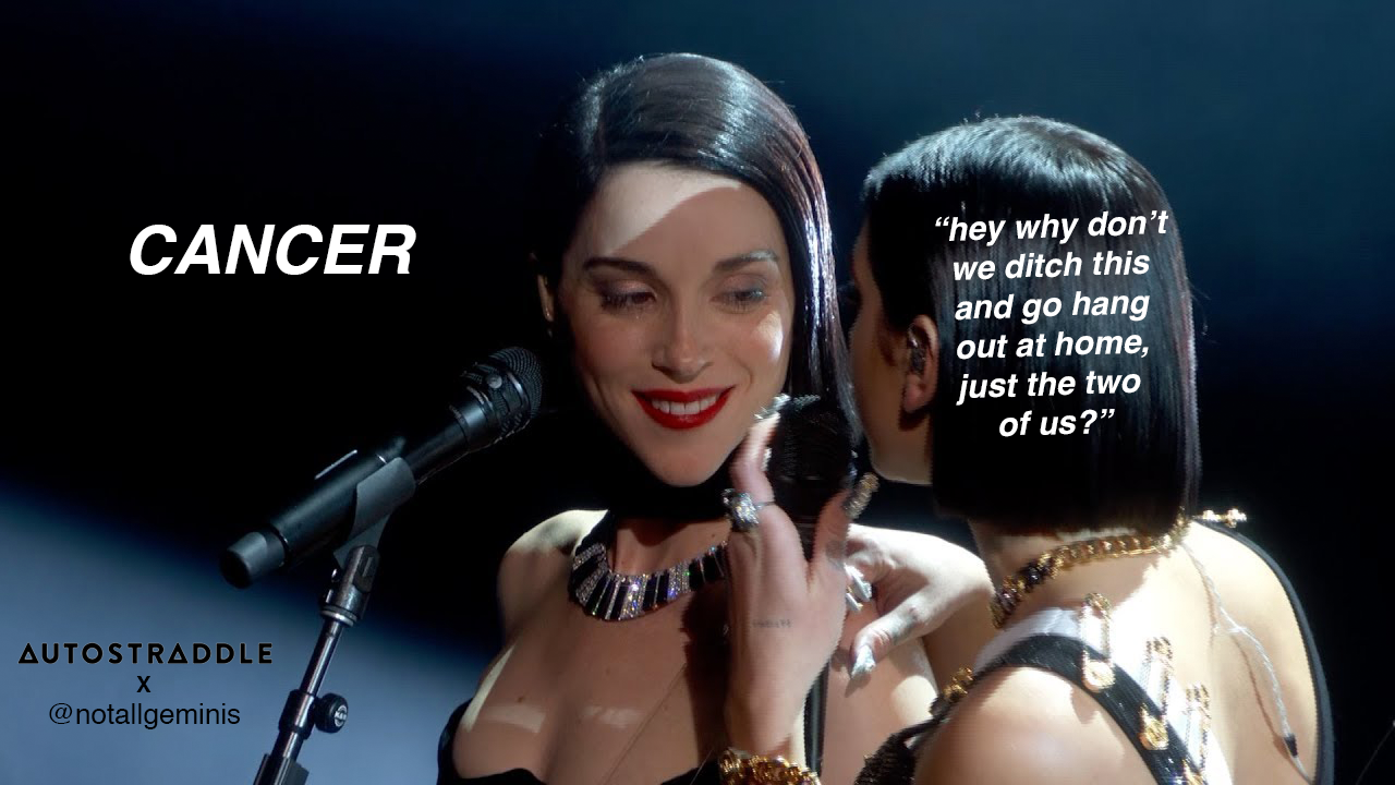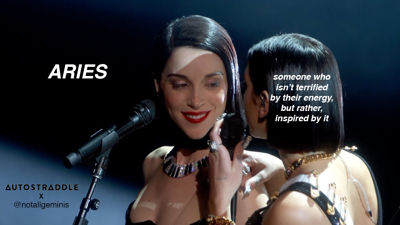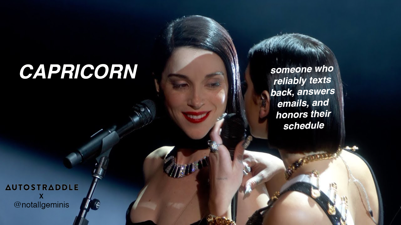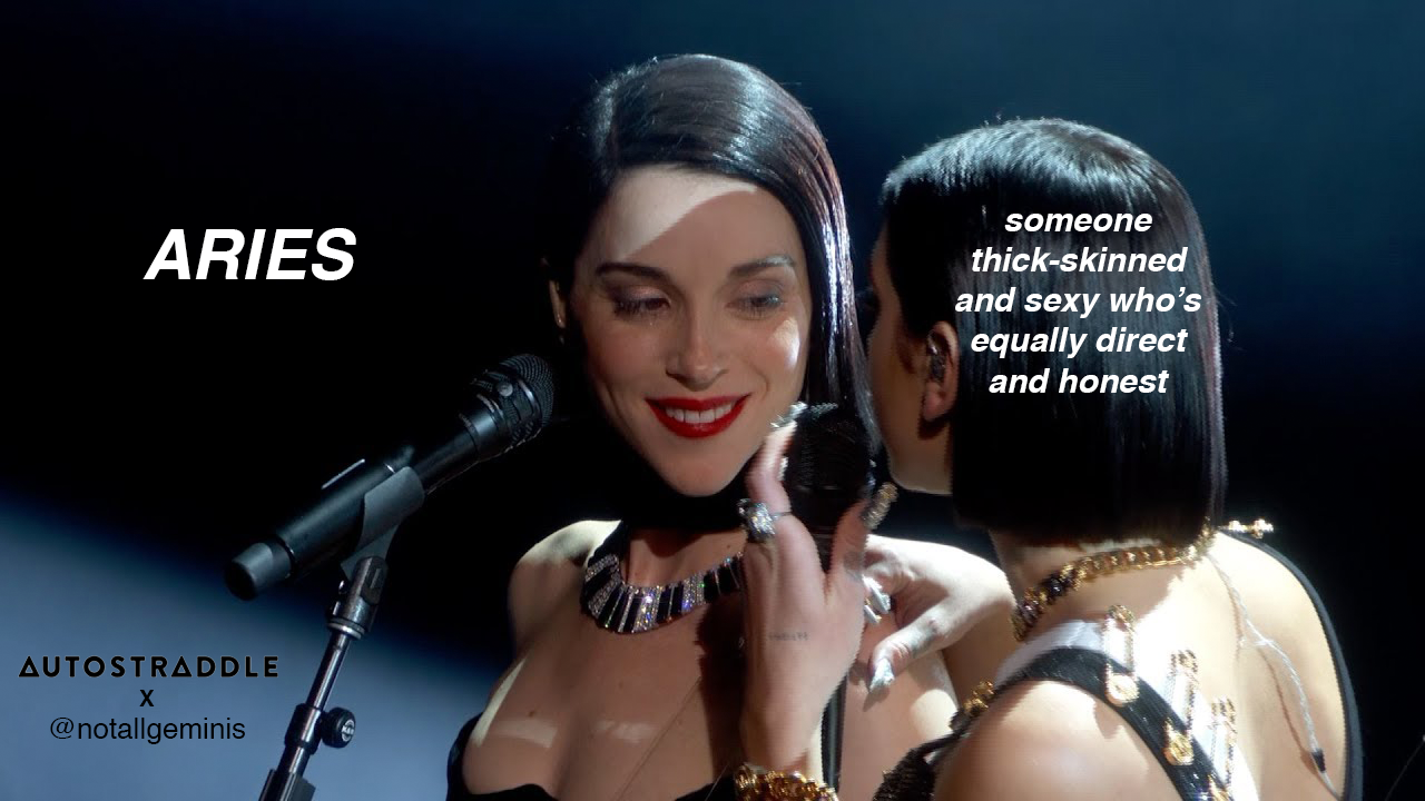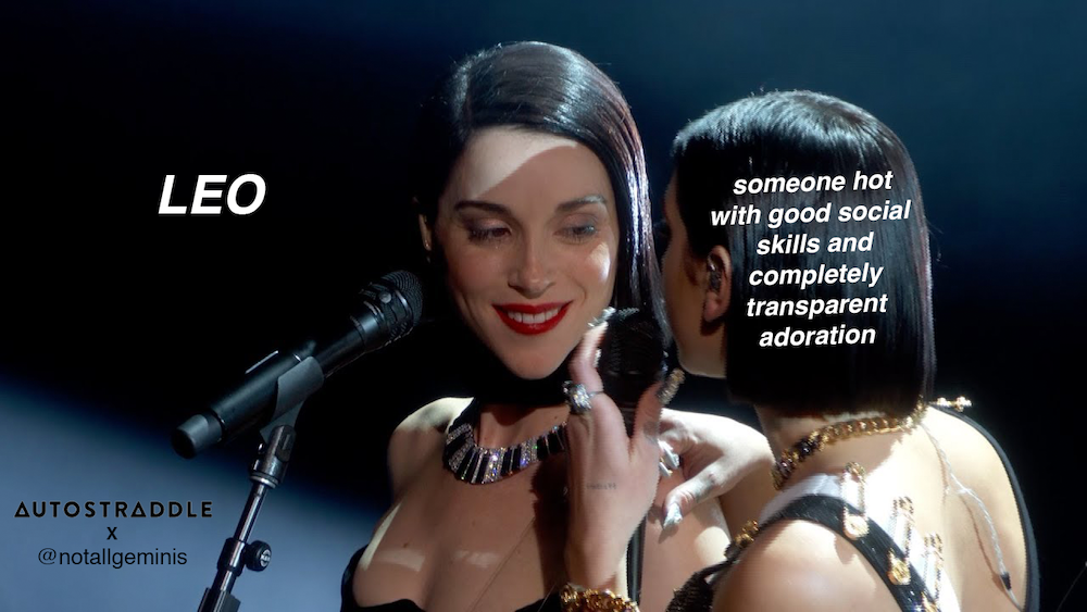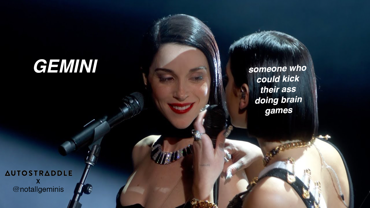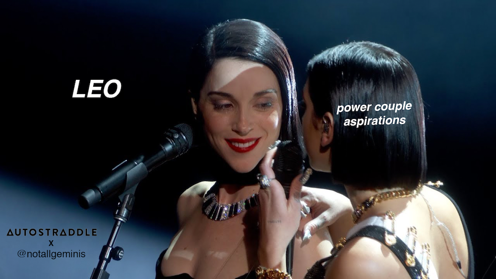 Happy Valentine’s Day, queers! We wanted to get you something special to show we really care, and we heard you like astrology and St. Vincent and Dua Lipa’s Grammy duet, so we teamed up with Courtney Perkins of @notallgeminis Instagram fame to bring you the sexiest smartest funniest memes y’all have ever seen roasting every single sign not once, not twice, but four times. Because you’re worth it. Please enjoy being called out over and over, and make sure to send this gift of a post to all the babes in your life. Oh, and obviously – tag yourself in the comments!