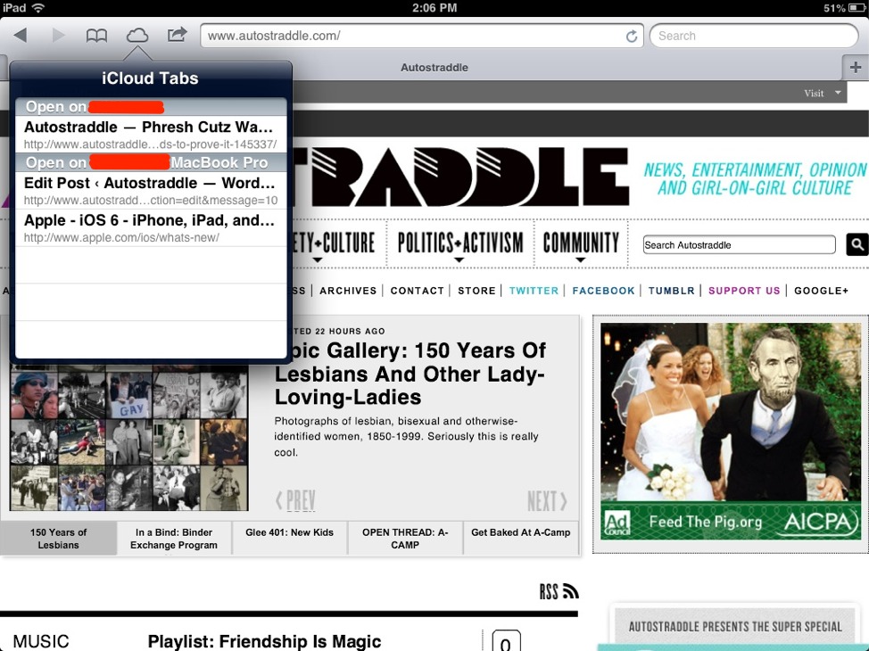 With iCloud tabs, you can begin reading an Autostraddle article on one device, and then just keep going on another device. The iCloud tab button is located at the top of your browser on the Mac and iPad