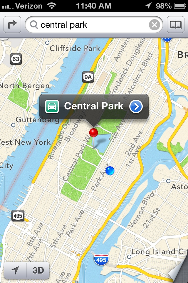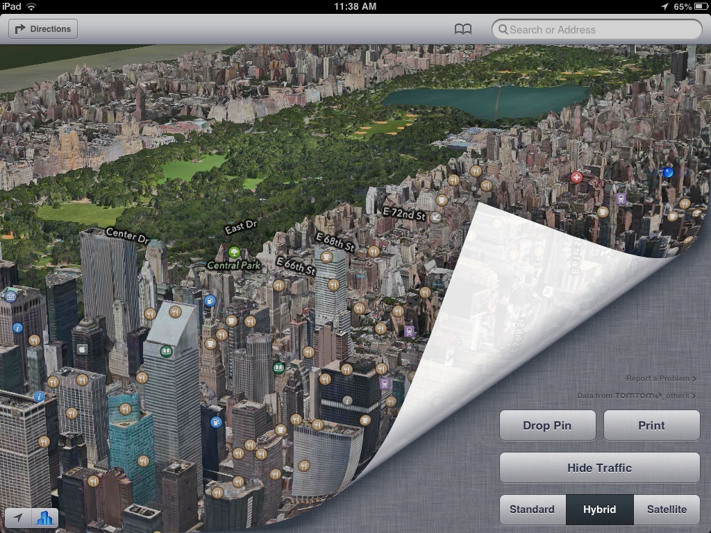 Google maps is out and Apple’s own map client is in! From fly over to turn by turn directions, very little is required for set up. Just tap the new “Maps” app on the home screen and poof, you’re there. Flyover, one of the new features, is a bit difficult to find. You have to be in either Hybrid or Satellite mode for it to work, then press the button in the lower left hand corner that looks like city buildings. Here’s an example: